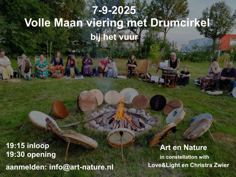 In de tuin bij Art& Nature, Ploeggang 1, 8431 NE, Oosterwolde, vanaf 19.00 tot 21:30, einde drumcirkel, daarna samen genieten bij het vuur, bijdrage op donatie basis vanaf 5 euro.