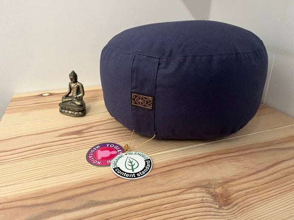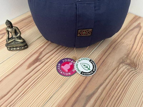 Yogi & Yogini meditatiekussen met binnen- en buitenhoes van 100% biologisch katoen, gevuld met natuurlijk boekweitkaf. Van het totale meditatiekussen is 6% biologisch. Organic Content Standard (OCS Blended) gecertificeerd.(*)