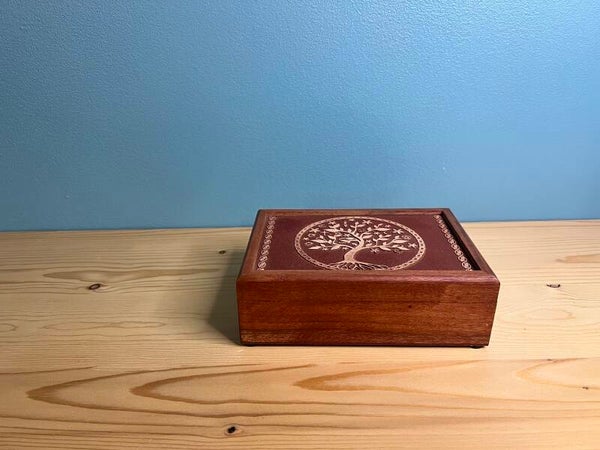 Tarotdoos met Tree of Life decoratie en binnenvoering.Houtsoort: Acacia.