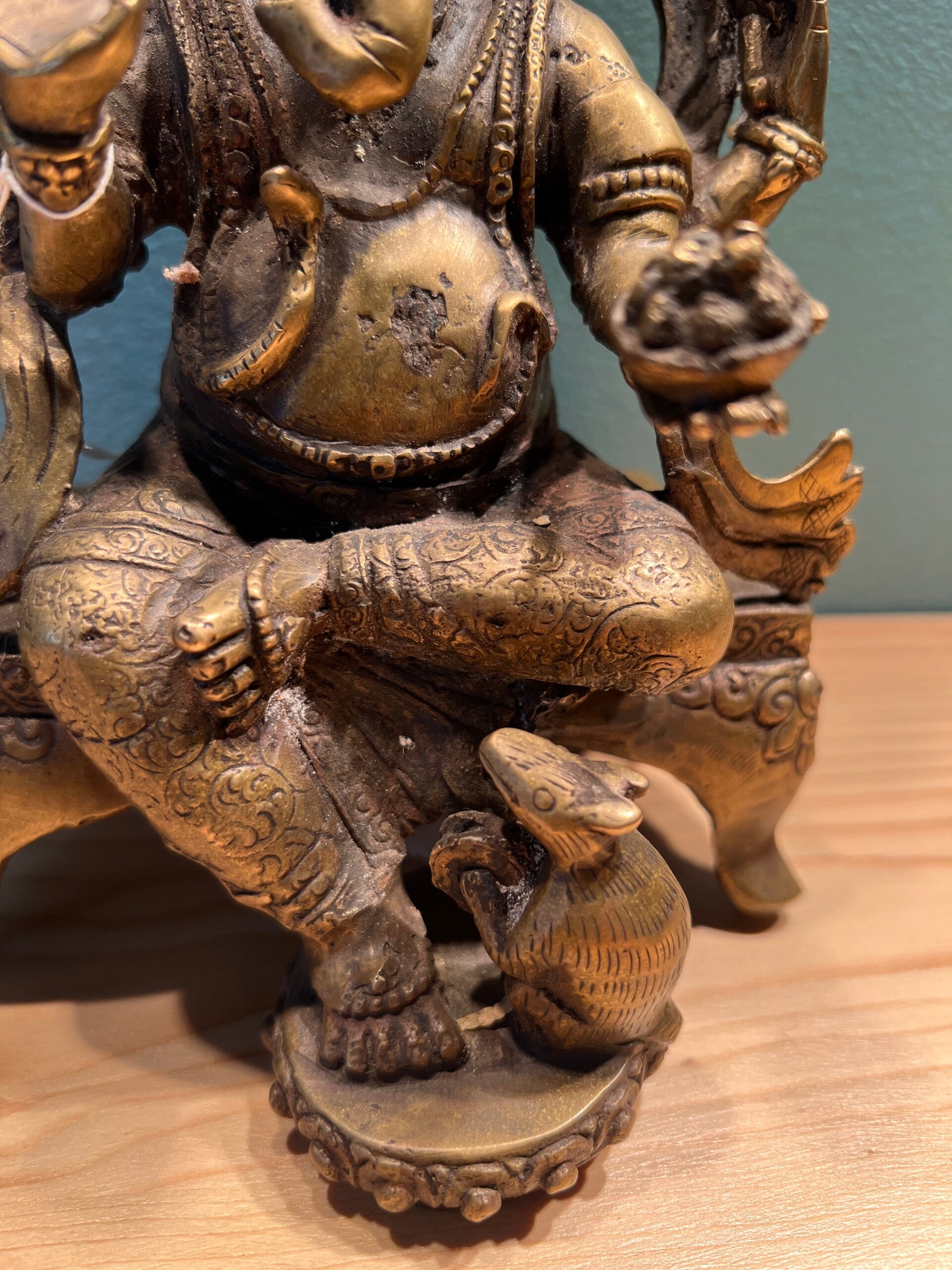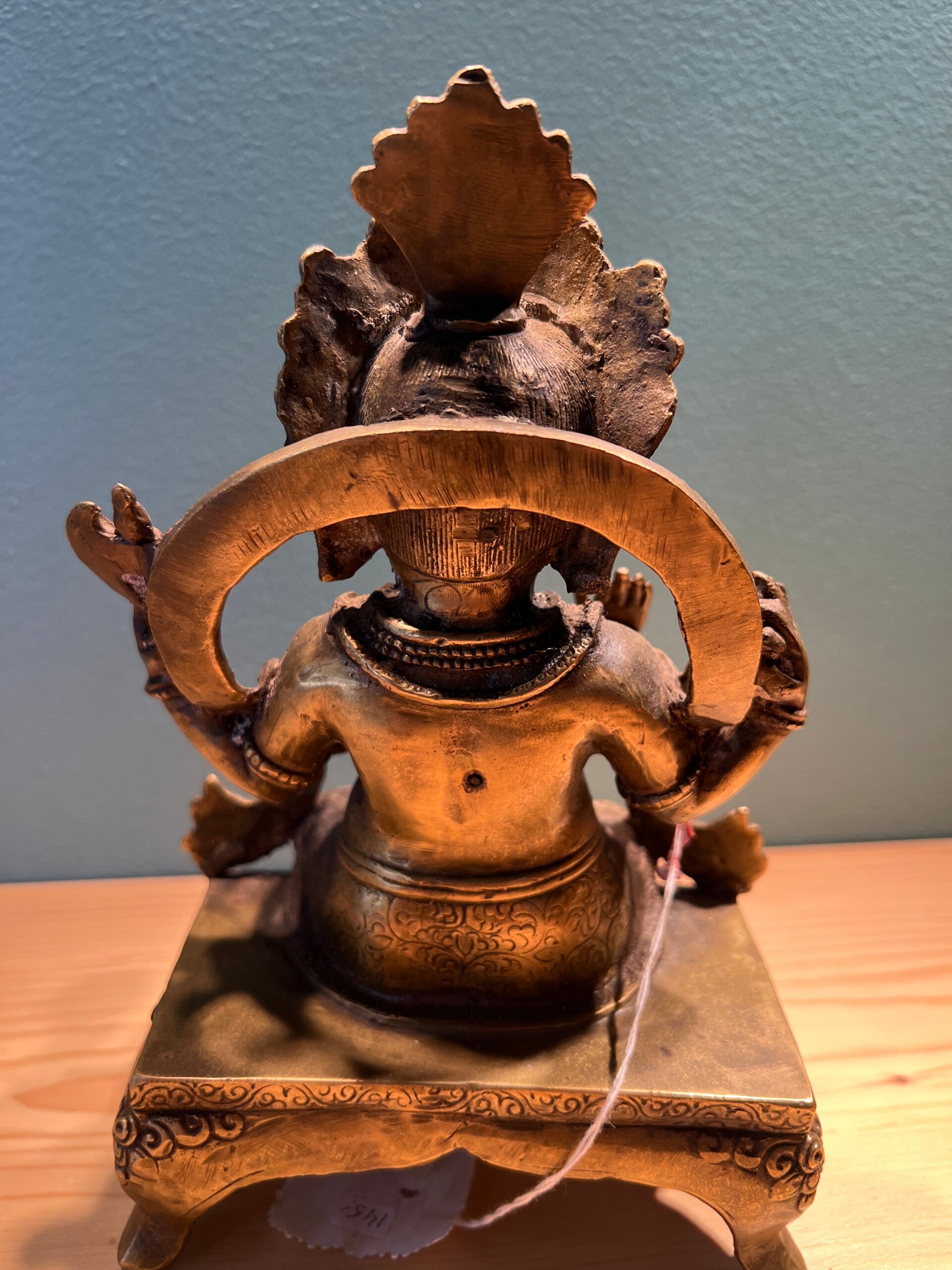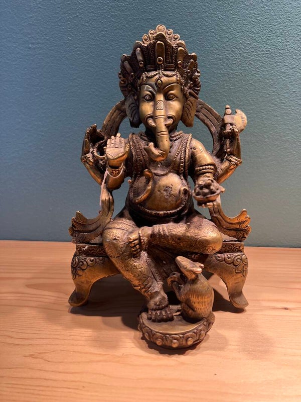 Dit messing beeld toont Ganesha in een zeldzame lalitasana (koninklijke rust) houding: één been gevouwen, het andere ontspannen, een houding die aanwezigheid combineert met openheid. In één hand houdt hij een modak , een traditioneel snoepje dat de vreugde van innerlijke groei symboliseert.