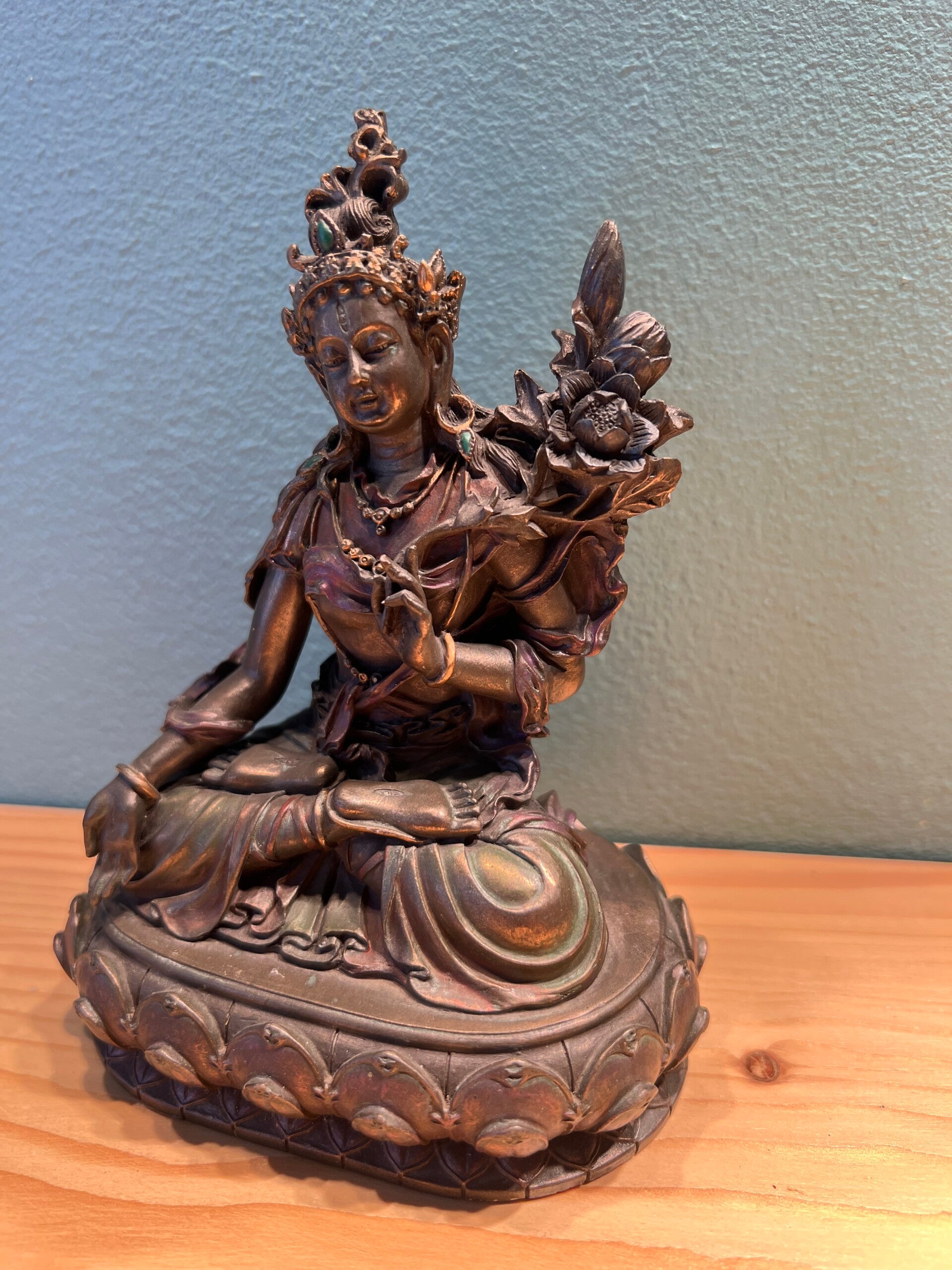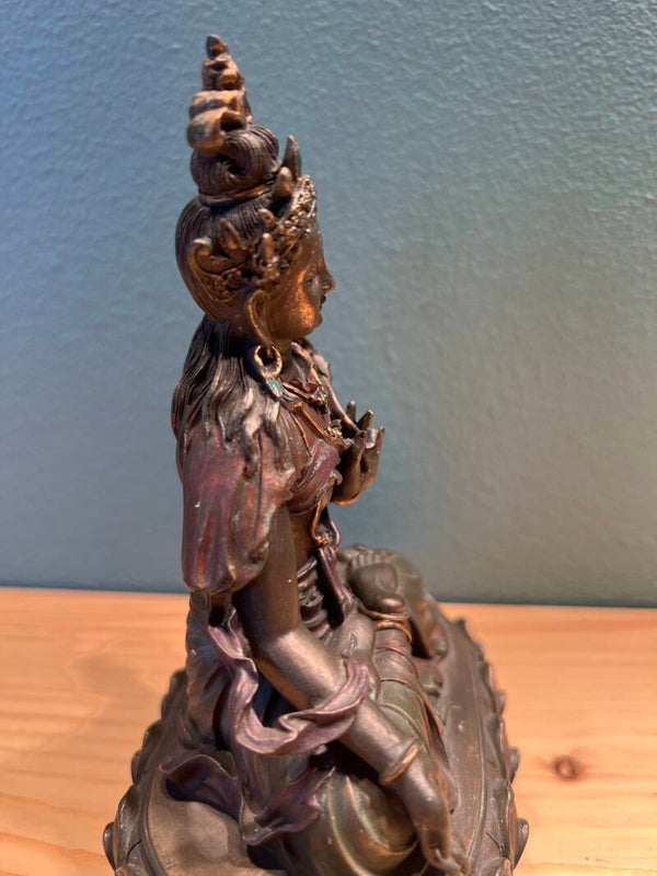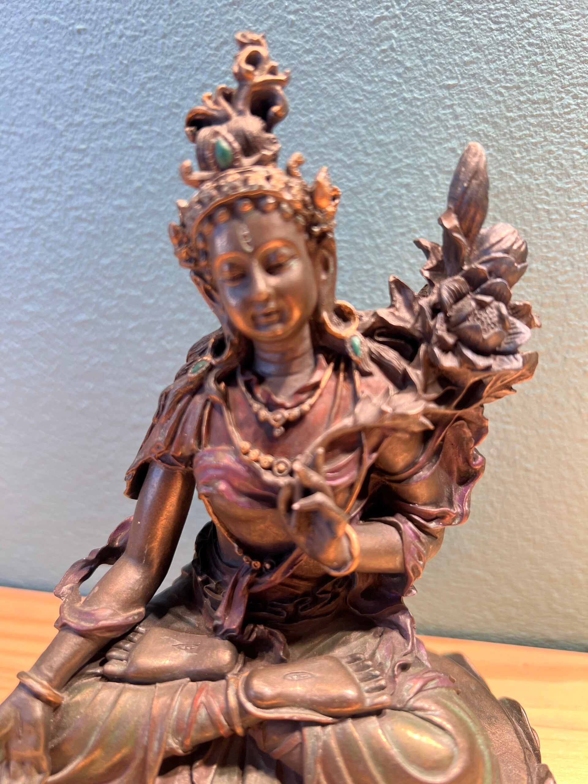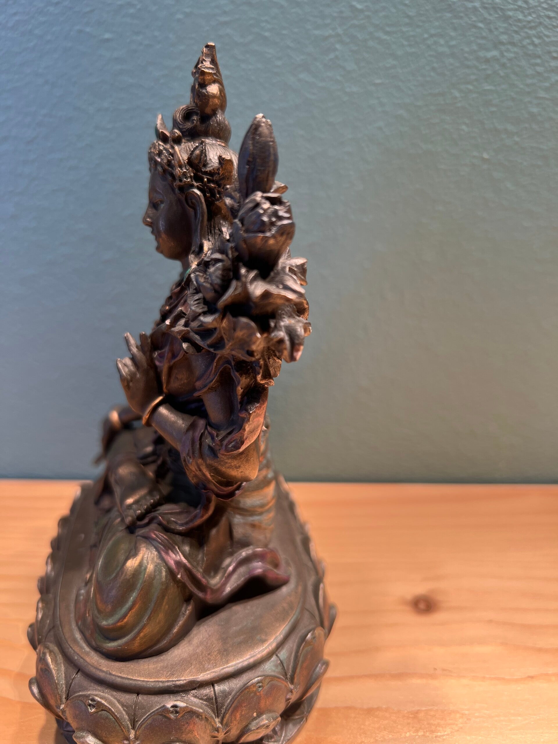 Het beeldje straalt sereniteit en zachtheid uit, waardoor het een prachtige toevoeging is aan een altaar, meditatiehoek of persoonlijke spirituele ruimte. De fijne details in de afwerking benadrukken haar gracieuze houding en de symboliek van vrede, mededogen en verlichting.