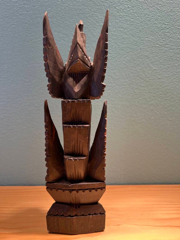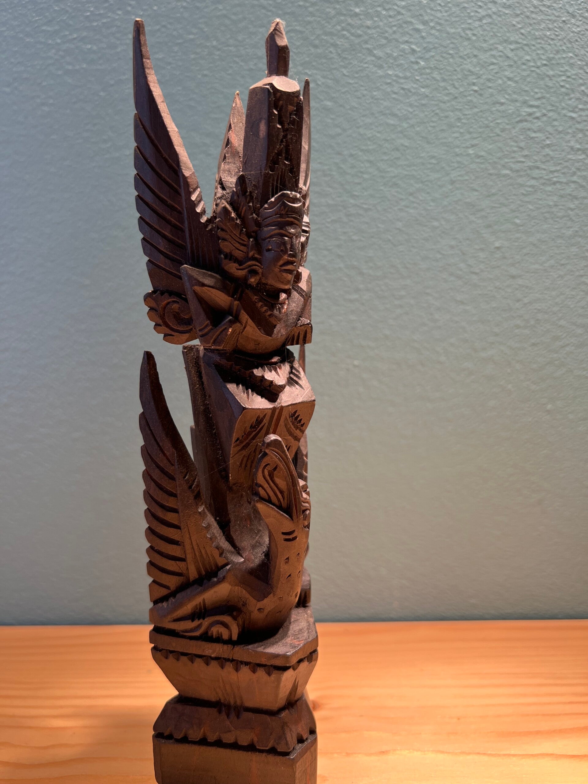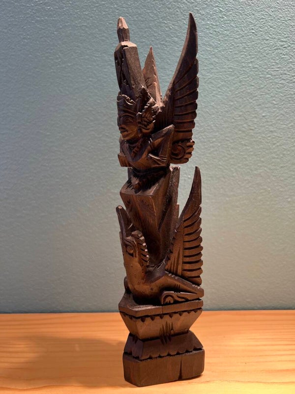 Met zijn handgesneden details en warme houten patina draagt dit beeld zowel een artistieke als spirituele waarde. Een prachtig object voor wie houdt van authentieke Aziatische kunst of krachtig symbolische decoratie.