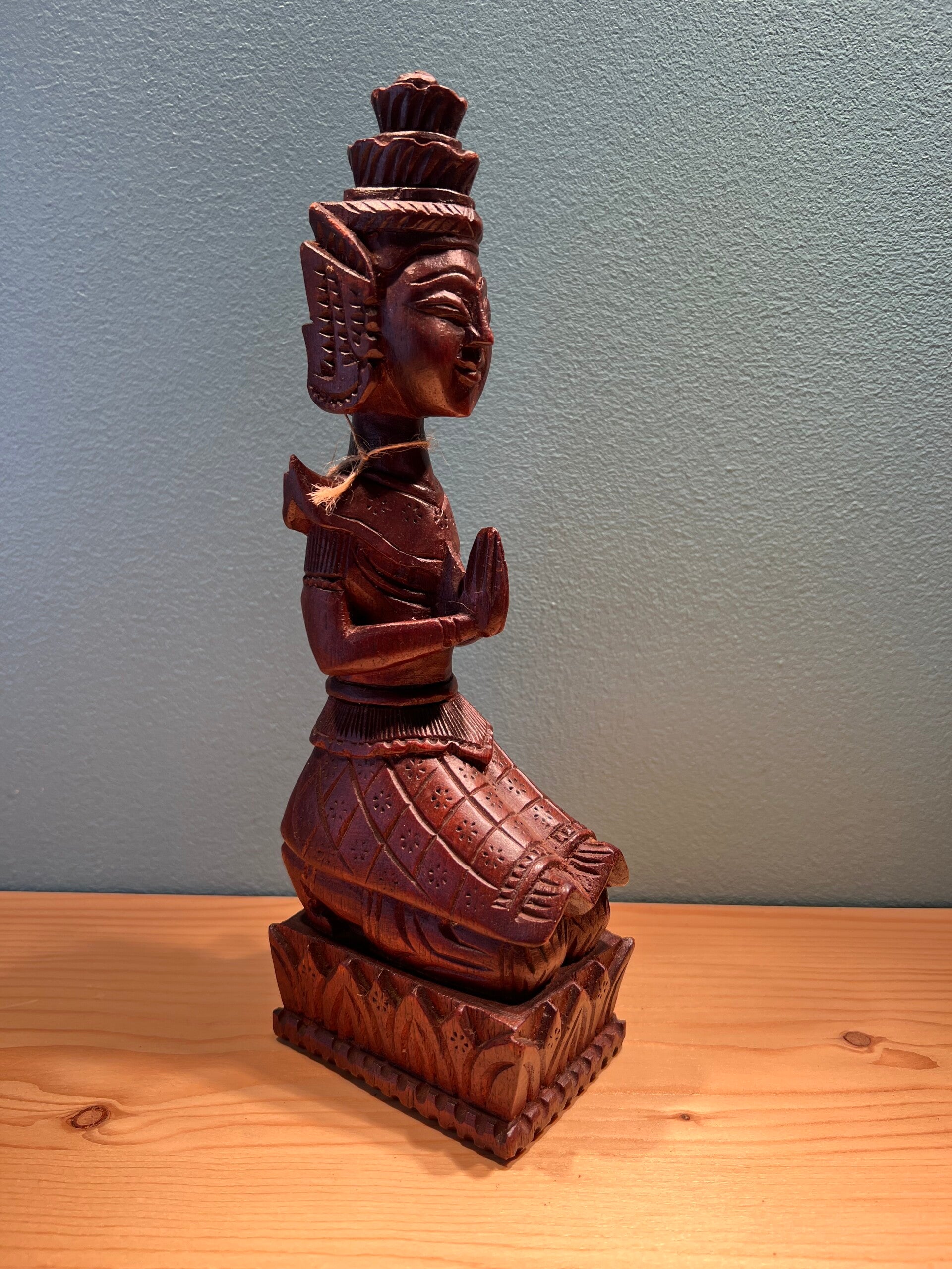 Deze prachtige Thaise beschermengel is met de hand gesneden uit hout en toont een sierlijke figuur zittend op een lotusbloem, het symbool van zuiverheid en spirituele verlichting. Het beeld straalt rust, bescherming en gratie uit – kwaliteiten die diep verankerd zijn in de Thaise spirituele traditie.